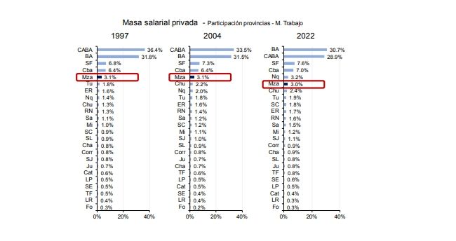 En este marco, el informe destacó que a Mendoza le ha ido peor que al promedio nacional. Otro dato a destacar está en la masa de asalariados formales que, pese a mantenerse en torno al 3% en los últimos 25 años, pasó del quinto al sexto lugar entre 1997 y 2022. Según Jorge Day y en función de diversas estimaciones, tanto Mendoza como otras provincias se han mantenido en números estables. San Juan y Neuquén mejoraron un poco de la mano de la minería y el petróleo, respectivamente. Incluso fue Vaca Muerta la culpable del desplazamiento al sexto lugar en la masa de asalariados.