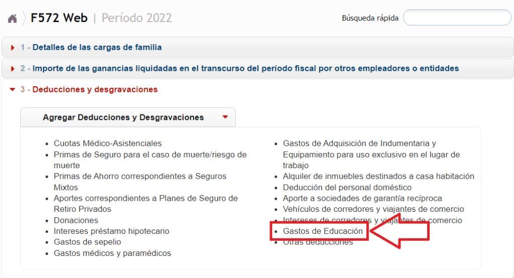 Paso 4: Vas a ver en pantalla 5 opciones y la última dice Ajustes. Vas a la opción número 3. Abrís la solapa que dice Agregar deducciones y desgravaciones y allí, como indica la imagen siguiente, vas a ingresar en “Gastos Educativos”.