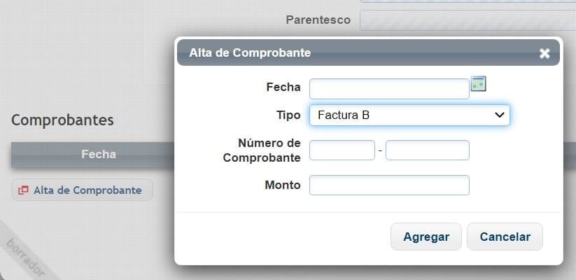 Luego de cargar la entidad automática que, colocando el CUIT aparece por defecto, se deben cargar los comprobantes de gastos como indica la pantalla de abajo.
