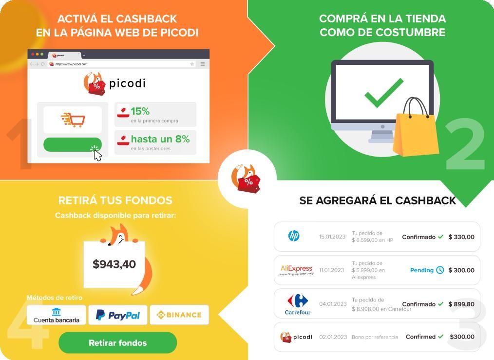 Picodi actualmente ofrece cupones de descuento y cashback en más de 200 tiendas que operan en Argentina. Entre ellos se encuentran, por ejemplo, Dafiti, AliExpress, Carrefour, Booking y La Anónima Online. El dinero recaudado gracias al cashback se puede retirar a una cuenta bancaria, cuenta de PayPal o Binance.