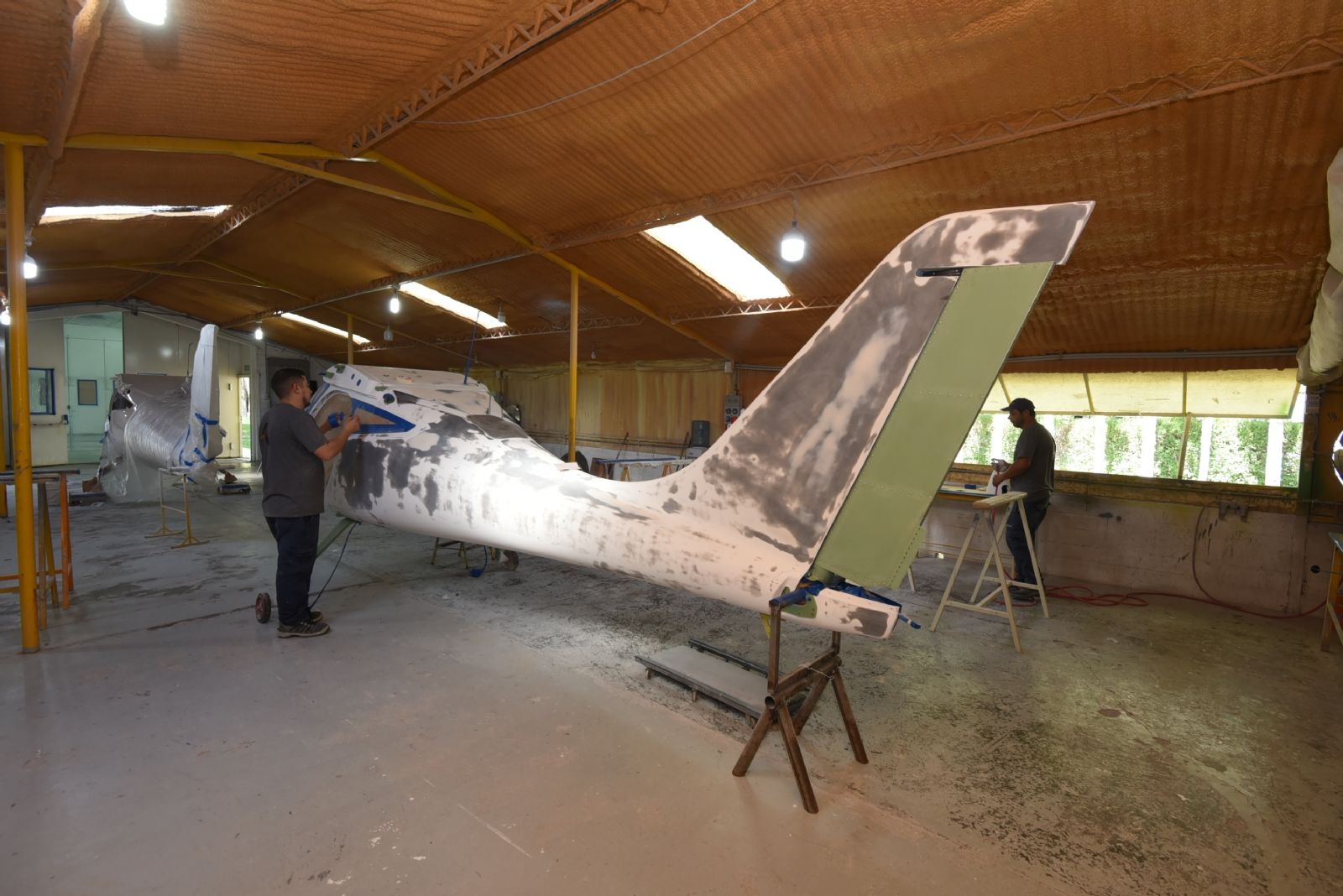 Aquí comienza la parte de pintura de terminación y sellado del avión. El básico es el blanco, pero también se puede elegir plateado o diseños personalizados, como muchos clientes piden. Una vez que se pasa a la "parte limpia", comienza una tarea que requiere de la máxima precisión. Se trata de la instalación del motor y su vinculación con los comandos de cabina. “Es un trabajo artesanal”, definió el ingeniero Diego Rodríguez, gerente de Calidad de Aerotec y Responsable Técnico de los aviones que se ensamblan en la planta.