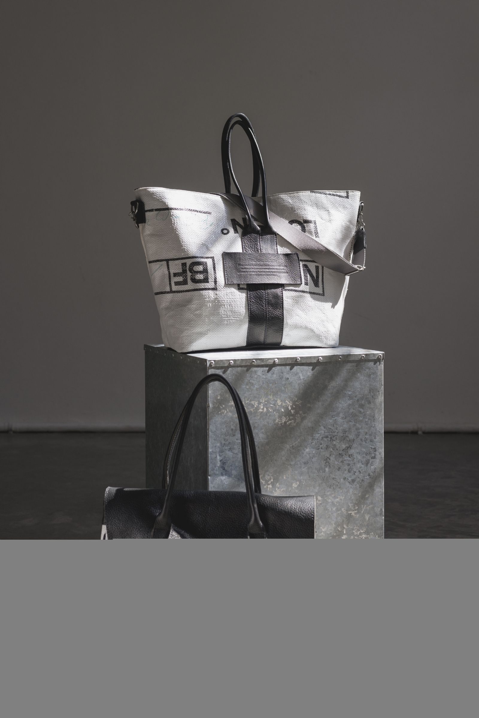 Tras este proceso, las big bags se convierten en rollos de tela de 15 a 20 metros. El material es polipropileno de alta resistencia (se asemeja a una arpillera de plástico), que luego del proceso creativo de diseño y aplicaciones de cuero argentino de descarte, se convierte en productos de alta calidad.