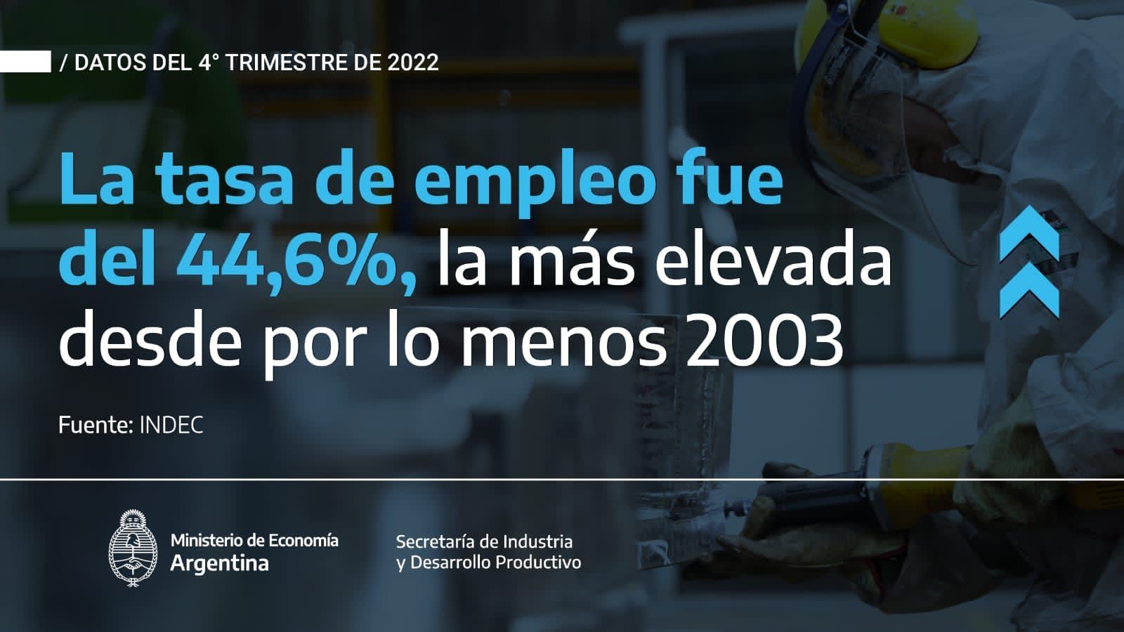 Por su parte, la tasa de empleo del último trimestre de 2022 fue del 44,6%, la más elevada desde por lo menos 2003 (junto con el segundo trimestre de 2022 cuando presentó el mismo valor). Aumentó 1 p.p. con respecto al mismo trimestre de 2021, lo que representa 648,5 mil personas ocupadas más. Respecto a 2019 fue superior en 1,6 p.p, lo que significa más de 1,30 millones de personas ocupadas adicionalmente.