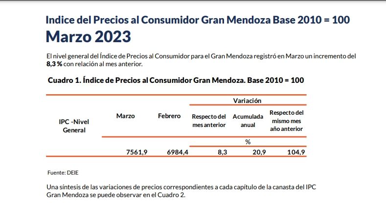 La Dirección de Estadísticas e Investigaciones Económicas de Mendoza (DEIE) informó este viernes por la tarde que la inflación en Mendoza durante el mes de marzo fue de 8,3%. El acumulado anual es de 20,9 y el interanual -es decir el mismo mes del año anterior- de 104,9%.