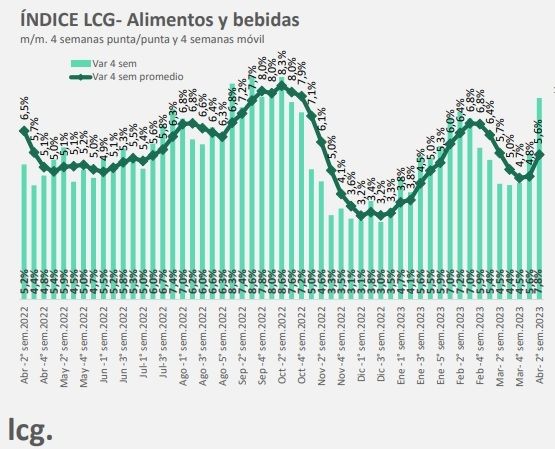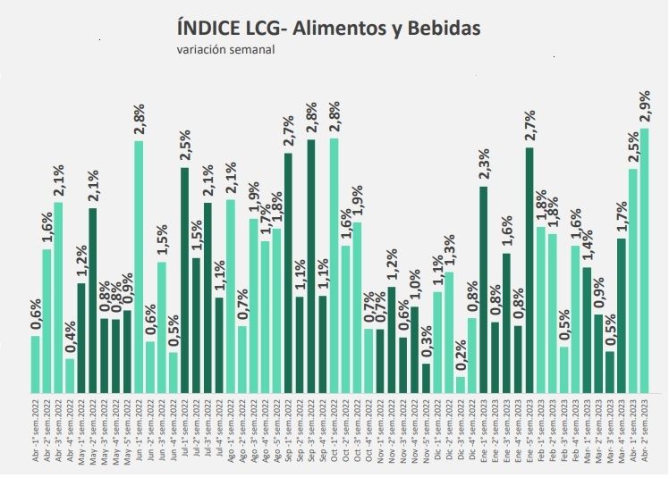 En la última semana de marzo, el aumento en el rubro alimentos, clave en la medición de la inflación general, fue del 1,7%, mientras que la semana siguiente trepó 2,5% y la última semana 2,93%. Sólo en lo que va del mes "acumula un 5,5% de inflación", indicó LCG.
