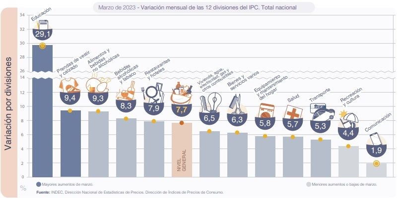 En marzo el rubro que más creció fue Educación, con un impresionante 29,1%, debido a las subas en todos los niveles educativos al inicio del ciclo lectivo. Completan el podio Prendas de vestir y Calzado con 9,4% y Alimentos y Bebidas no alcohólicas, con un salto de 9,3%.
