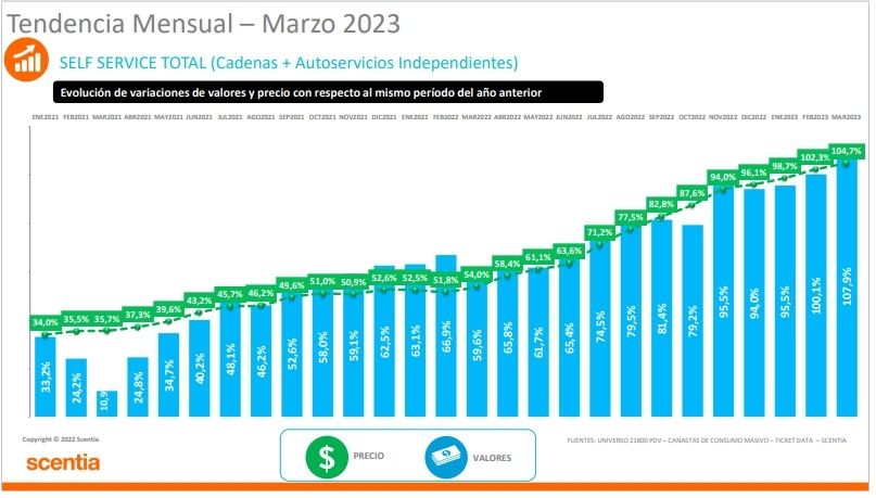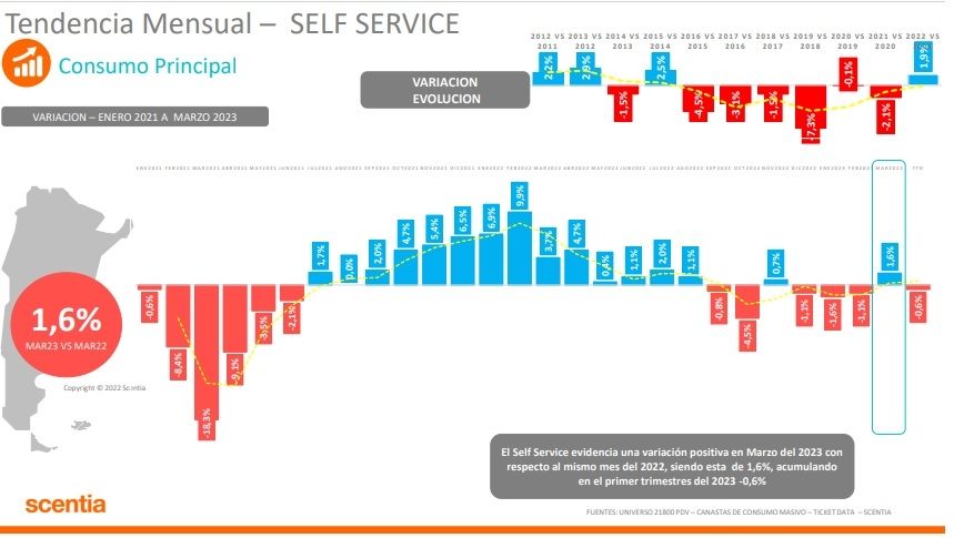 "El desempeño de marzo mantuvo la tendencia del supermercado, creciendo 10,4%, pero en esta ocasión se logró un saldo positivo en la suma de ambos canales, a pesar de la caída de -6% en Autoservicios", indicó Osvaldo Del Río, titular de la consultora Scentia, que difundió este miércoles el informe correspondiente a los datos de marzo.