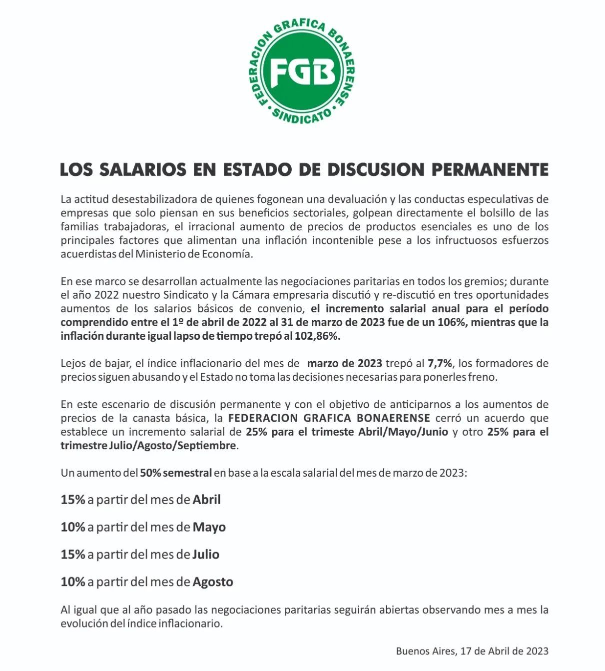 La histórica Federación Gráfica Bonaerense firmó un aumento del 50% en base a la escala salarial del mes de marzo de 2023. Los aumentos serán del 15% en abril, del 10% en mayo, del 15% en julio y del 10% en agosto. En el boletín que distribuyó deja en claro que la estrategia de los sindicatos en la "discusión salarial permanente".