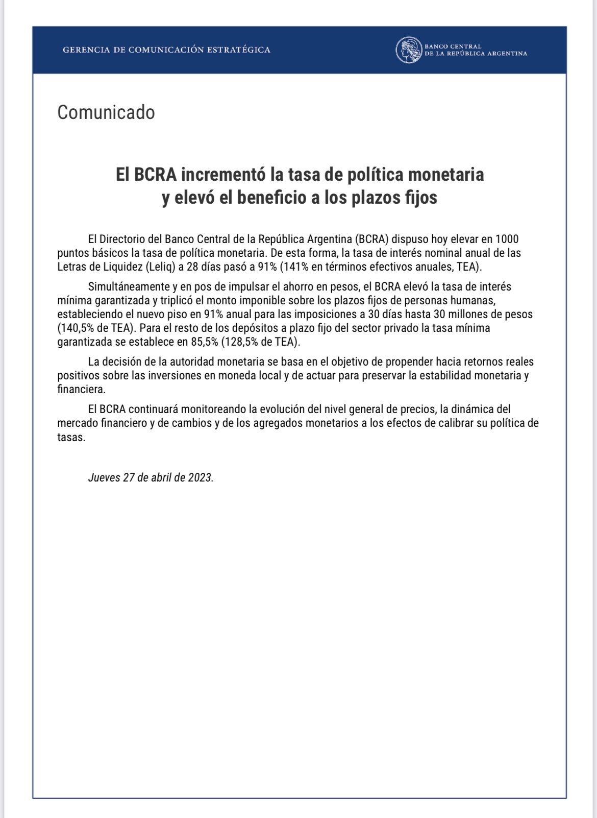 En paralelo, se aplicará esta suba para los depósitos a plazo fijo a 30 días, de modo que la tasa de referencia pasó del 81% al 91% nominal anual. Además, triplicó el monto imponible sobre los plazos fijos de personas humanas, estableciendo un tope de 30 millones de pesos.