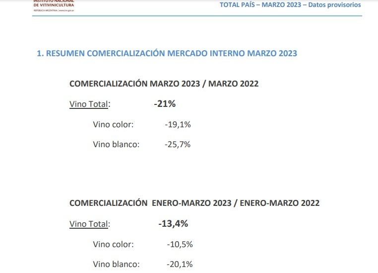 El Instituto Nacional de Vitivinicultura (INV) anticipó los datos de comercialización de vino dentro del mercado interno. En marzo de 2023 los despachos bajaron 21% mientras que en el acumulado trimestral se registró una merma en el consumo del 13%. Desde la industria comentaron que es un resultado prácticamente cantado ya que la situación económica suele impactar en las decisiones de compra.