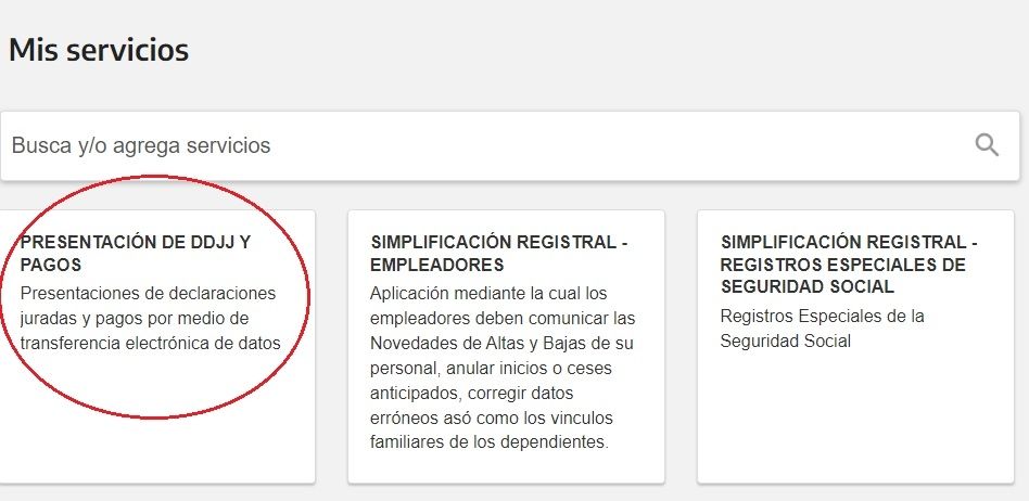 -El sistema desplegará en pantalla la lista de servicios de AFIP que tenés habilitados. Seleccioná Presentación de DDJJ y Pagos.