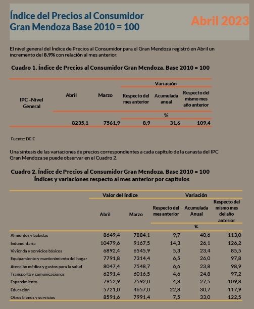 La Dirección de Estadísticas e Investigaciones Económicas de Mendoza (DEIE) informó este viernes por la tarde que la inflación en Mendoza durante el mes de abril fue de 8,9%. El acumulado anual es de 29,8.