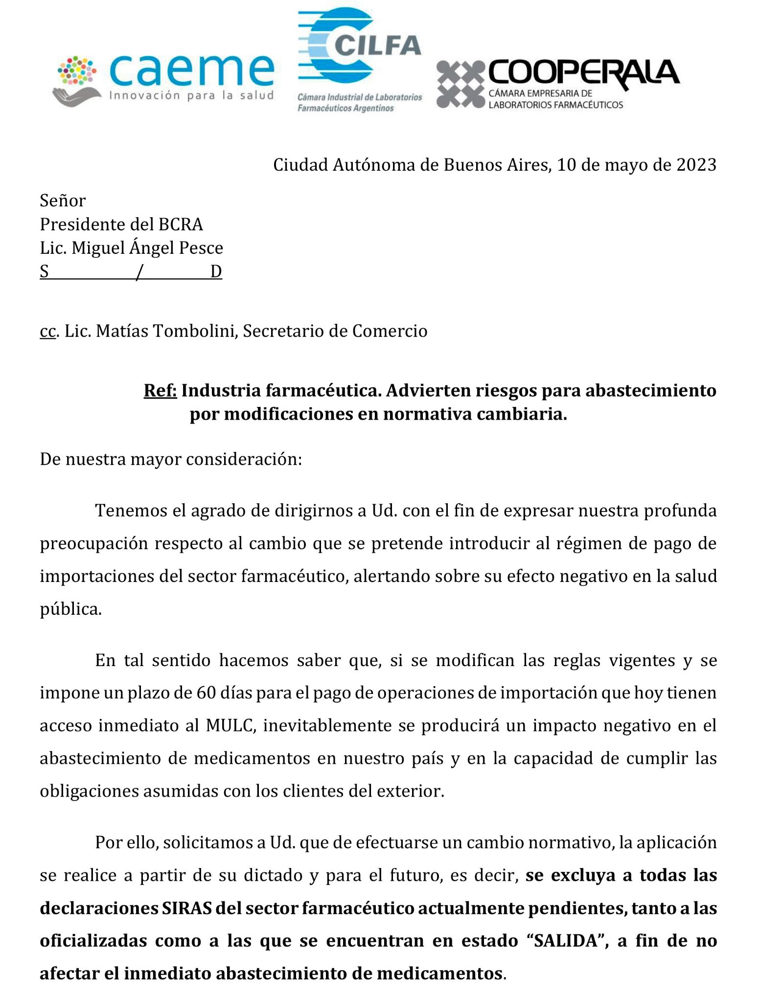 Desde CAEMe (Cámara Argentina de Especialidades Medicinales), CILFA (Cámara Industrial de Laboratorios Farmacéuticos Argentinos) y COOPERALA (Caámara Empresaria de Laborataorios Farmacéuticos) expresaron su "profunda preocupación respecto al cambio que se pretende introducir al régimen de pago de importaciones del sector farmacéutico, alertando sobre sus efectos negativos en la salud pública".