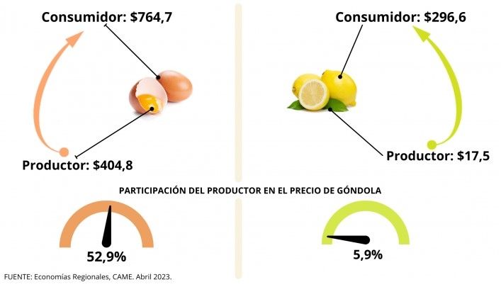 El mismo informe establece que la participación del productor explicó el 23% de los precios de venta final, y los productores de huevo tuvieron la mayor participación (52,9%), mientras que la menor fue para los de limón (5,9%).