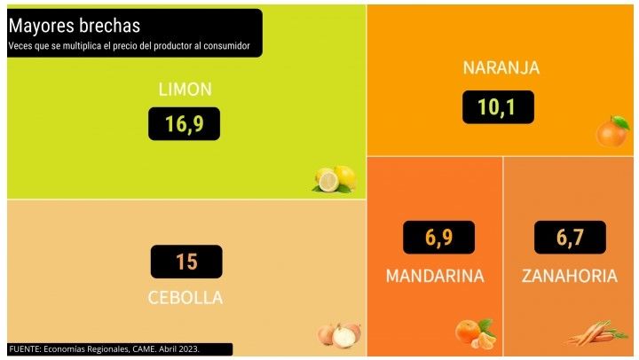 En el caso del limón, que registró la mayor brecha en abril entre los precios de origen y destino, “los precios disminuyeron en ambos extremos de la cadena: productor (-24,3%) y consumidor (-15), en tanto que en origen, la caída respondió a los bajos precios registrados en Salta y Tucumán, ya que los productores están vendiendo en el mercado interno a precio de costo -o incluso inferior-, al disminuir las exportaciones por la suba de costos internos y pérdida de competitividad”, explicaron desde CAME.