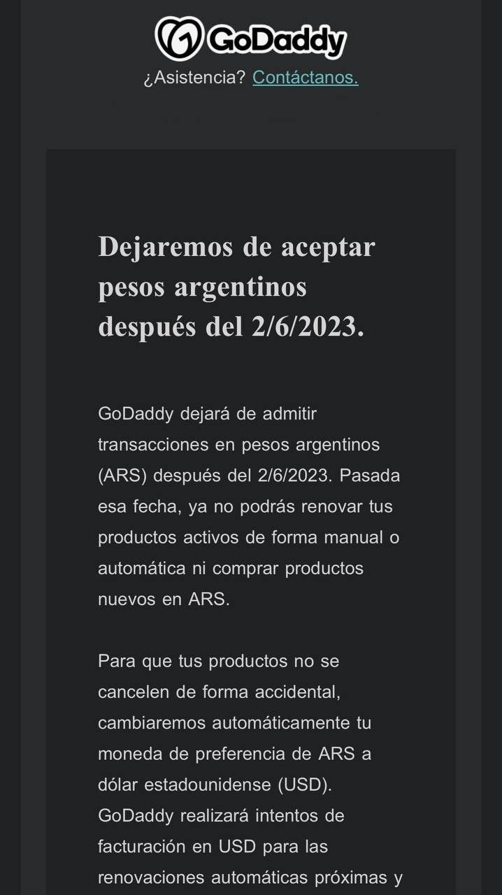 Es el caso de la mayor empresa de dominios de del mundo y proveedora de servicios de hosting, GoDaddy, que anunció que desde el 2 de junio ya no aceptará pagos en pesos por servicios brindados en la Argentina.