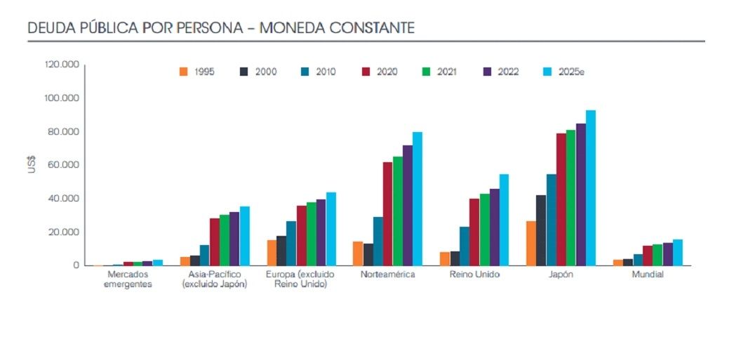 A finales de 2022, el valor total de la deuda pública mundial se disparó 7,6% en moneda constante, hasta alcanzar la cifra récord de US$ 66,2 billones, el doble que en 2011. En 2022, el Gobierno de Estados Unidos se endeudó más que todos los demás países juntos.