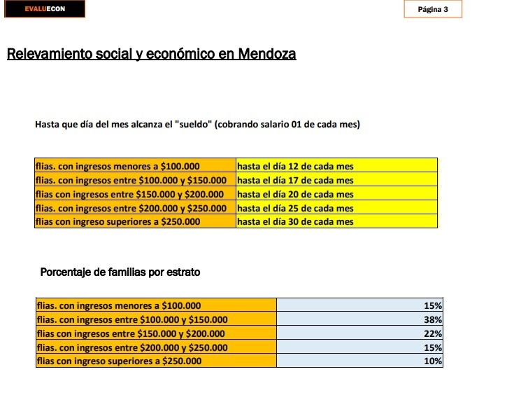 El informe de Evaluecon detalló que cerca del 15% de las familias registran ingresos de unos $100.000 mensuales y ven cómo sus fondos se terminan el día 12 de cada mes. En tanto, quienes reúnen _entre todos los miembros del grupo_ entre $100.000 y $150.000 pueden sostener los gastos hasta el día 17. Se trata del 38% de las familias por lo que, rigor, la mayoría de las personas apenas supera la quincena.