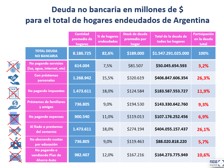 El trabajo informal, la cantidad de hogares en niveles pobreza o en el umbral de ingreso para ser pobre hace que muchos deban recurrir a deudas no bancarias para financiar su costo de vida. La mayor participación de este tipo de endeudamiento son: