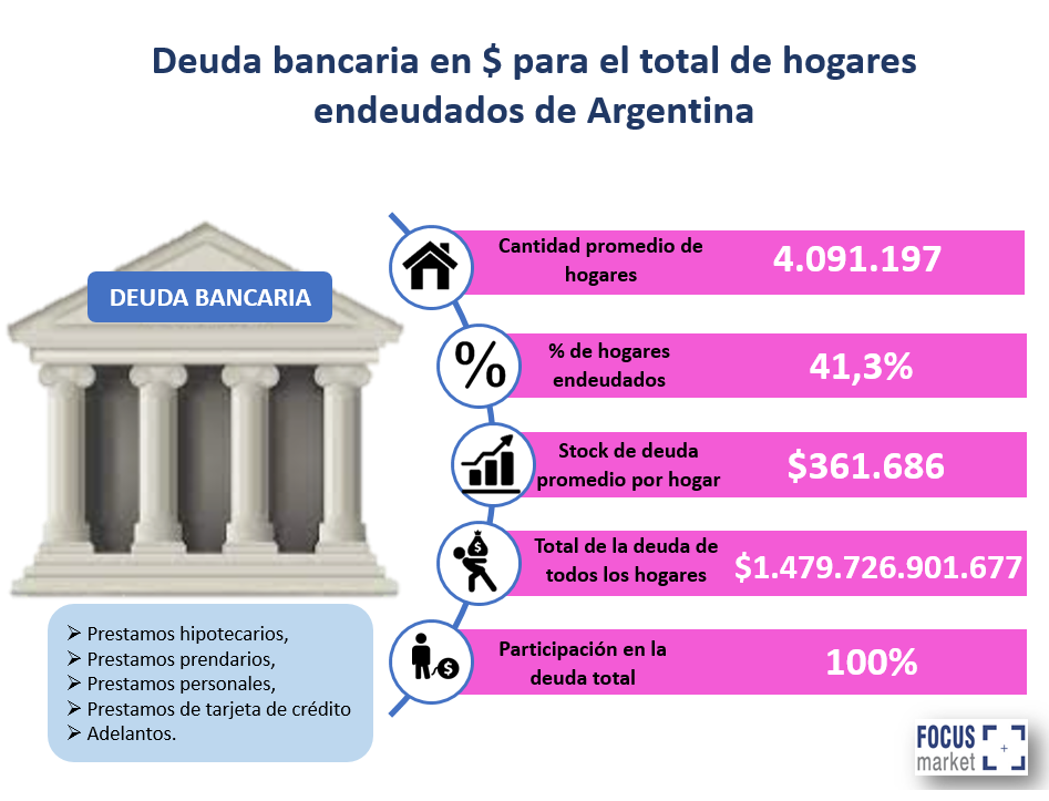 Se entiende como deuda bancaria préstamos a sola firma, préstamos hipotecarios, préstamos prendarios, préstamos personales, préstamos en tarjeta de crédito y adelantos. Según el informe de Focus Market, la cantidad promedio de hogares que mantienen endeudamiento de este tipo son un 41,3%. En promedio, la deuda es de $361.686.