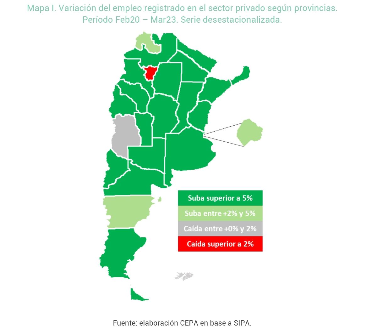 Los datos surgen del último informe del Sistema Integrado Previsional Argentino (SIPA) referido a la evolución del empleo privado registrado de marzo y en él se revela que en 19 provincias (Catamarca, Formosa, Tierra del Fuego, La Rioja, Misiones, San Luis, Chaco, Santiago del Estero, La Pampa, Río Negro, San Juan, Córdoba, Santa Fe, Neuquén, Entre Ríos, Corrientes y Santa Cruz, Buenos Aires y Salta) el crecimiento respecto de febrero de 2020 es mayor al 5%.
