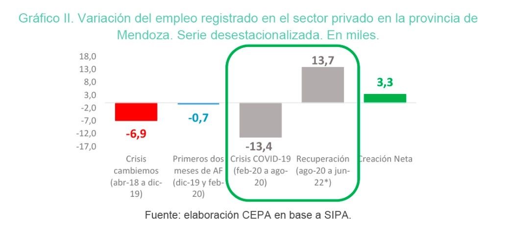 “Antes del inicio de la pandemia, el empleo privado ya se encontraba en una situación crítica: la crisis del Gobierno de Cambiemos significó la destrucción neta de 6.909 puestos a diciembre de 2019 (y 7.566 al mes de febrero de 2020). En marzo de 2023 faltan recuperar 4.288 puestos para llegar a los niveles de empleo previos a la crisis del gobierno de Cambiemos -a diferencia de la media nacional que ya recupero los niveles de abril de 2018”, precisó el informe de CEPA.
