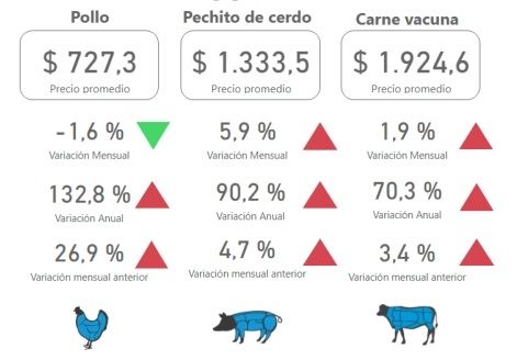 Además, si se analiza el comportamiento de los diversos tipos de carne ofrecidos en carnicerías y supermercados, se observa que mientras que la carne de vaca aumentó 70,3% el último año, la carne de pollo trepó 132,8% en los últimos doce meses, aunque venía de subir menos que la carne vacuna hasta el mes pasado, cuando subió 26,9%, mientras que el precio bajó 1,6% en mayo, hasta quedar en $727,3 promedio.