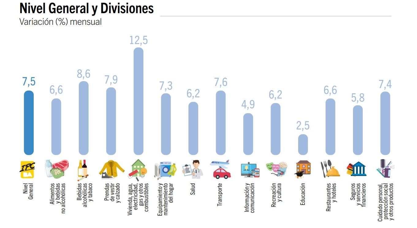 Los rubros que más crecieron fueron Vivienda, agua, electricidad, gas y otros combustibles, Alimentos y bebidas no alcohólicas, Transporte, Restaurantes y hoteles y Salud, que en conjunto explicaron el 71,6% del alza del Nivel General.