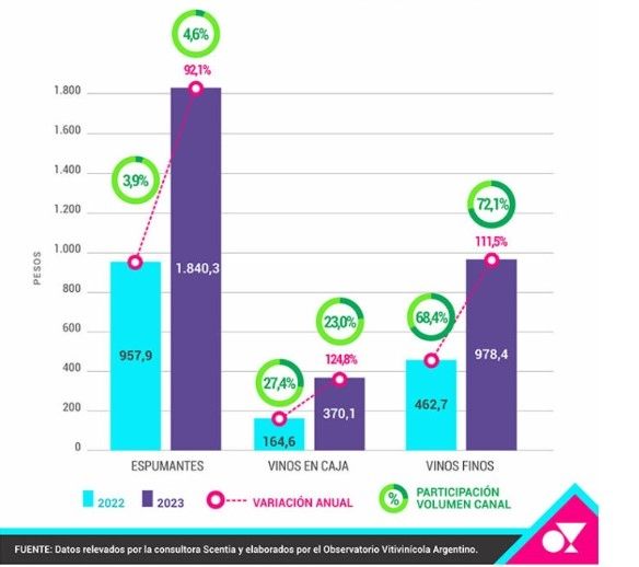 Sobre este punto, al analizar la evolución de la participación total de ventas, el informe de Scentia señaló que este tipo el vino en caja, el que más aumentó en precio, perdió participación en el total de ventas. De este modo, pasaron del 27,4% del total en el primer trimestre de 2022 al 23% en igual período de 2023.
