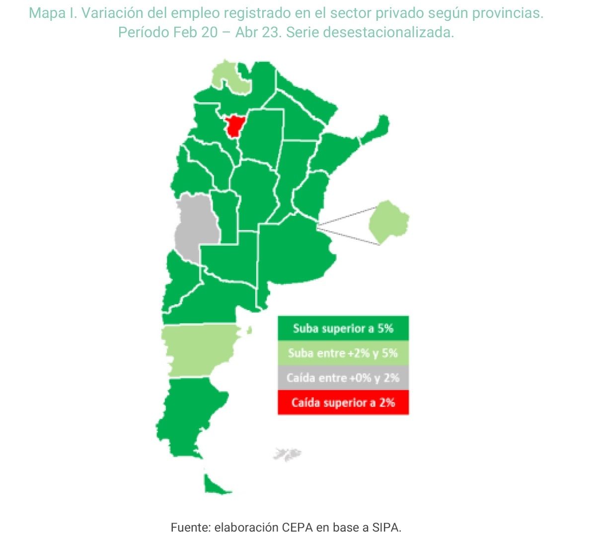 Los datos de abril de 2023 muestran que la mayoría de las jurisdicciones ya tienen mayores niveles de empleo que en febrero de 2020. En particular, Mendoza es una de las provincias cuya recuperación exhibió menor dinamismo (+1%), ubicándose sólo por encima de Tucumán (-4,6%).