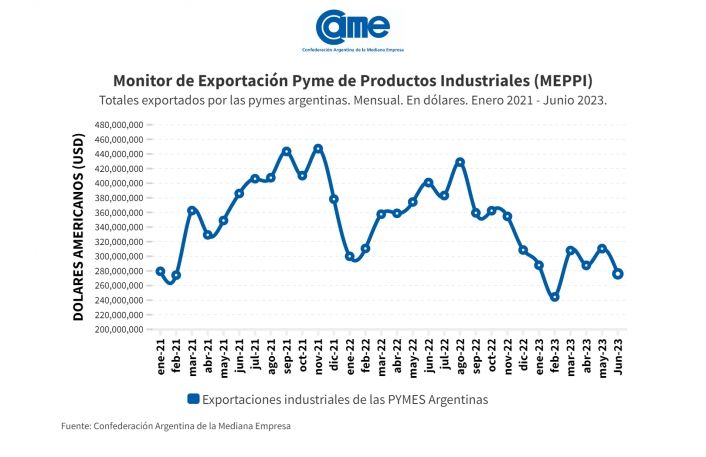 Las empresas pymes industriales exportaron un 18,5% menos en dólares durante el primer semestre del año y un 19,4% en toneladas, según el último informe del Monitor de Exportación Pyme de Productos Industriales (MEPPI) de la Confederación Argentina de Medianas Empresas (CAME).