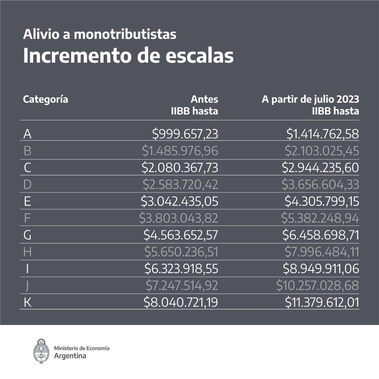 La categoría B, en tanto, tiene desde ahora un tope de $2.103.025,45 de facturación, tomando el período que va de julio 2022 a junio 2023, también para los monotributistas puros como para los que están exentos del componente impositivo. En cuanto a la cuota mensual, se mantiene en $6.430,38 en el primer caso y $ 5.473,11.