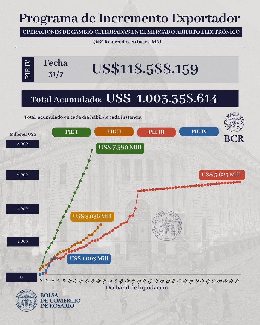 Pero el dato clave es el desempeño del dólar maíz a $340 por dólar, que también alcanza a las exportaciones de economías regionales. Este lunes sumó liquidaciones por US$ 118,59 millones, y en lo que va de julio el Programa de Incremento Exportador (PIE) totaliza ingresos por US$ 1.226,171 millones.