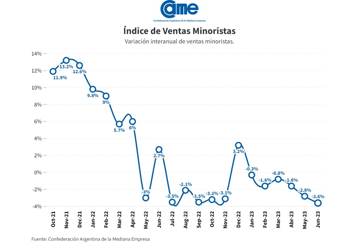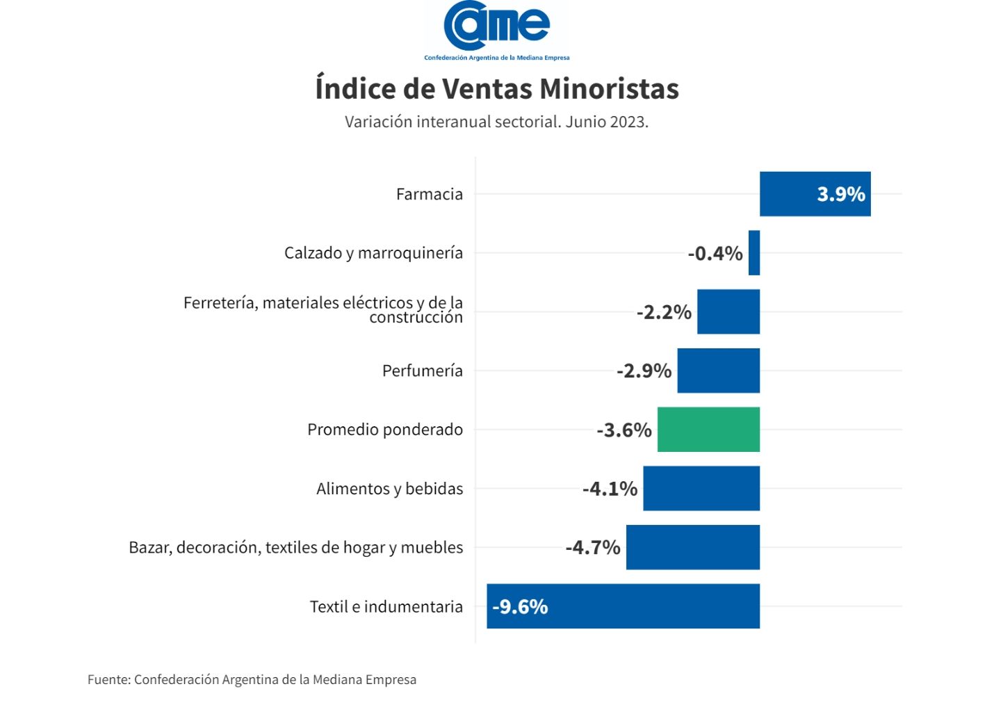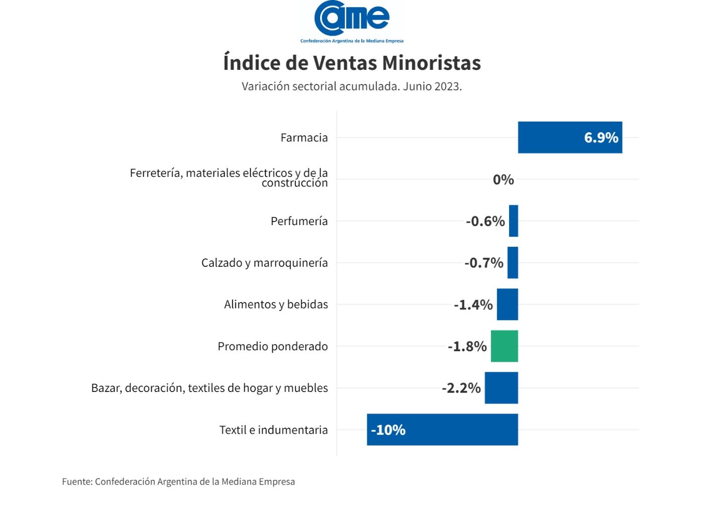 Así surge del Índice de Ventas Minoristas Pymes de la Confederación Argentina de la Mediana Empresa (CAME), elaborado en base a un relevamiento mensual entre 1.241 comercios minoristas del país, realizado del 3 al 7 de julio.