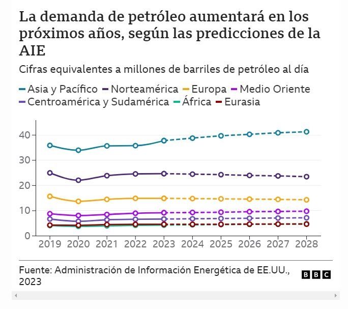 La proyección va hasta el año 2028, cuando la AIE cree que el mundo estará a punto de alcanzar la demanda máxima de petróleo.
