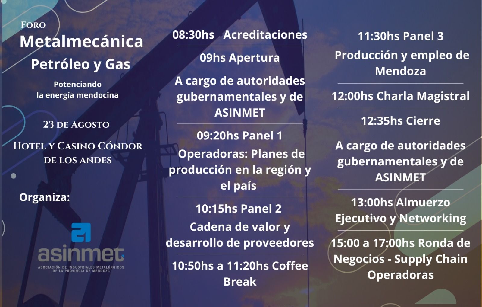 El destacado evento es organizado por la Asociación de Industriales Metalúrgicos de la Provincia de Mendoza (ASINMET) y se desarrollará en el Hotel y Casino Cóndor de Los Andes, ubicado en el departamento de Guaymallén de la provincia de Mendoza.
