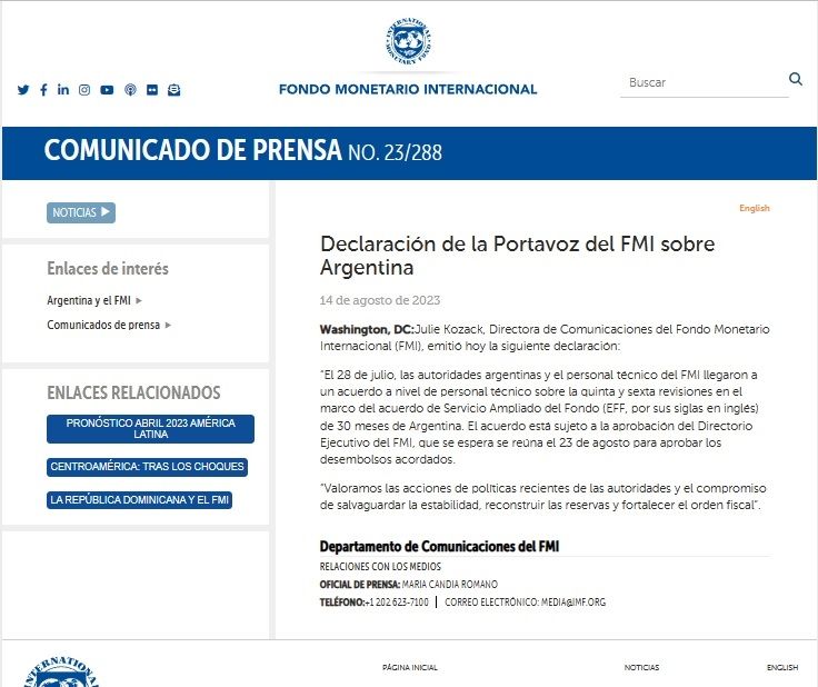 “El 28 de julio, las autoridades argentinas y el personal técnico del FMI llegaron a un acuerdo a nivel de personal técnico sobre la quinta y sexta, revisiones en el marco del acuerdo de Servicio Ampliado del Fondo (EFF, por sus siglas en inglés) de 30 meses de Argentina".