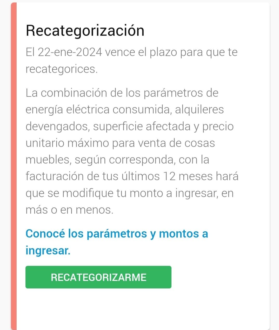 Paso 2: Allí dentro vas a ver tus datos personales y un cartel que dice Recategorización. Tené en cuenta que el 22 de enero de 2024 vence el plazo para que hacer la recategorización, en caso de corresponder, y debajo hay un cartel verde indicando dónde ingresar para recategorizarte.