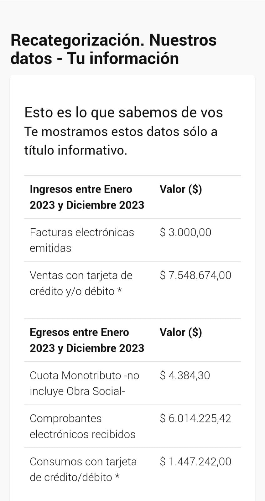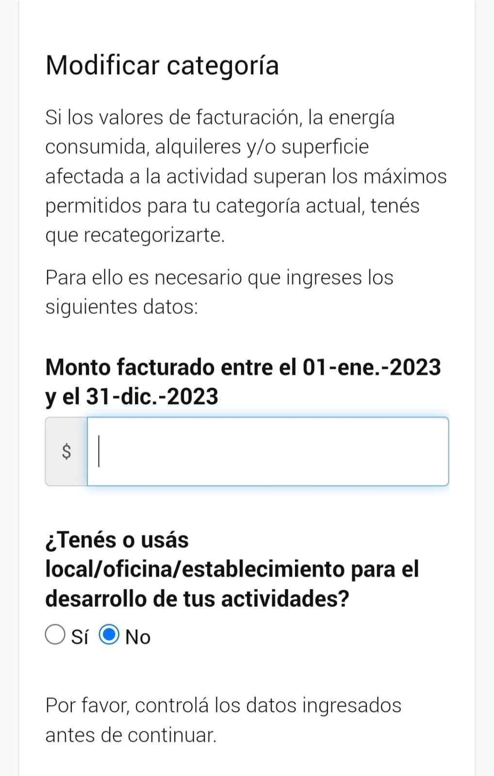 Paso 4: Final. En caso de no coincidir el monto que antes presentó la AFIP con tus registros, en esta pantalla podés colocar el monto que facturaste del 01/01/2023 al 31/12/2023, según tus cálculos. Lo ideal es que vos lleves un control de todas las facturas que emitiste los últimos 12 meses y también no te olvides de que si emitiste alguna nota de crédito, porque alguna vez te equivocaste con alguna factura o la tuviste que anular, esa nota de crédito se descuenta. Hay que considera que este paso actúa como una suerte de declaración jurada, por lo que es recomendable ceñirse a los datos reales.