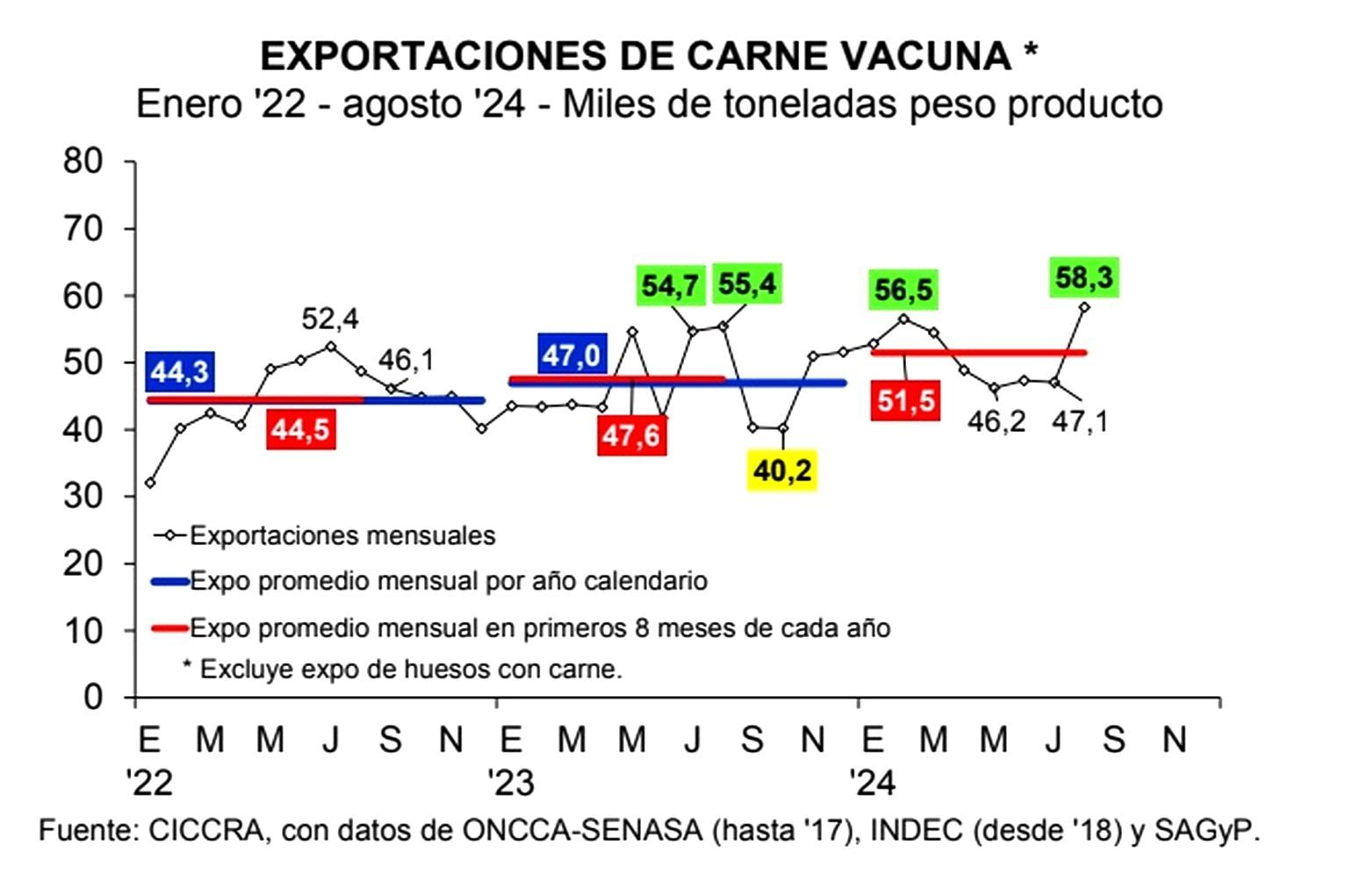 Las exportaciones de carne vacuna en el mes de agosto de 2024 tuvieron un crecimiento del 35,9% respecto del mes anterior y una mejora interanual del 5,1%, lo que representa el registro más alto de los últimos 45 meses, es decir, tres años y nueve meses.