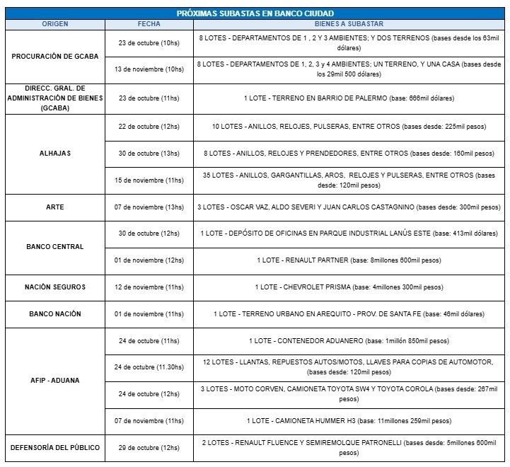 Es importante aclarar que los interesados deben inscribirse hasta 48 horas hábiles anteriores a la subasta, por lo que, si bien queda tiempo, hay que apurarse para estar habilitado a ofertar si se quiere acceder a alguno de los primeros lotes. Hay que registrarse en https://subastas.bancociudad.com.ar y realizar la transferencia del monto de caución, que es un monto variable, dependiendo de las condiciones específicas de cada subasta).