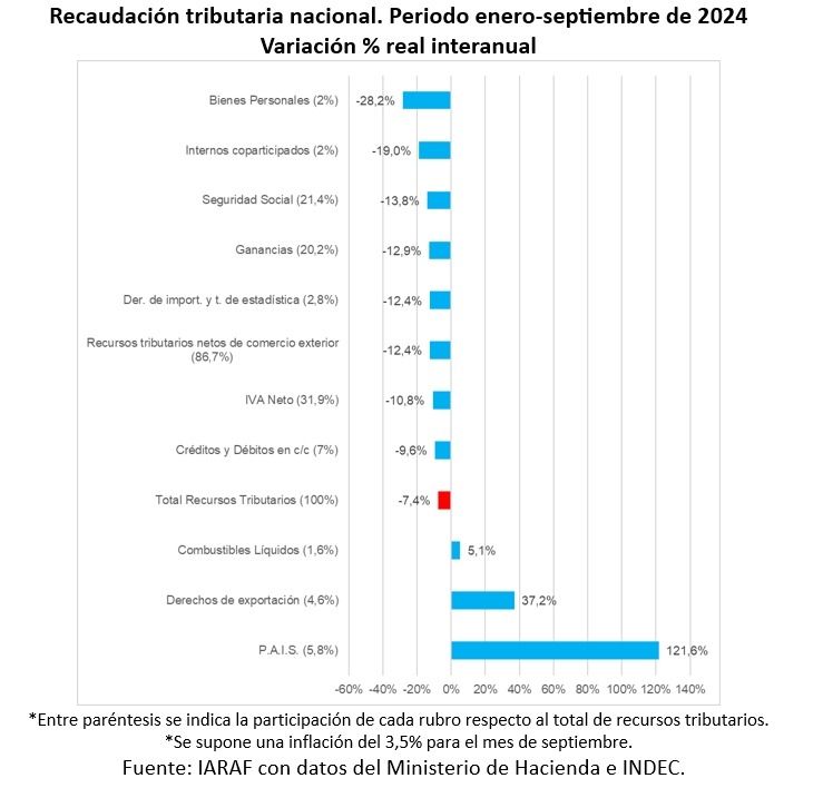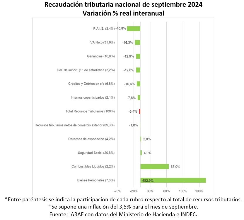 Según los datos de septiembre publicados el martes por la AFIP, el mes pasado la recaudación tributaria nacional solo habría descendido un 3,4% real respecto a septiembre de 2023. Sin embargo, siempre hay un impuesto estrella que permite que la caída no sea mayor. En este caso, fue el tributo a los Bienes Personales, que gracias a la aplicación de un anticipo para adelantar pagos mejoró sustancialmente los ingresos del organismo recaudador. Sin este tributo, la baja total de la recaudación hubiera sido del 9,6%.