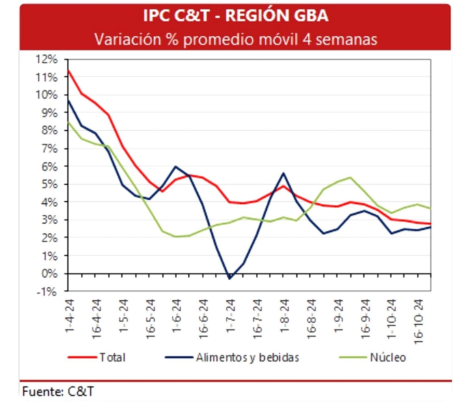 Una de ellas es C&T, que midió para la región GBA un alza mensual de 2,8% luego del 3,5% de septiembre, lo que constituyó la menor desde noviembre de 2021. Según el estudio la variación interanual se redujo a 196,4%, siendo la más baja desde noviembre del año pasado.