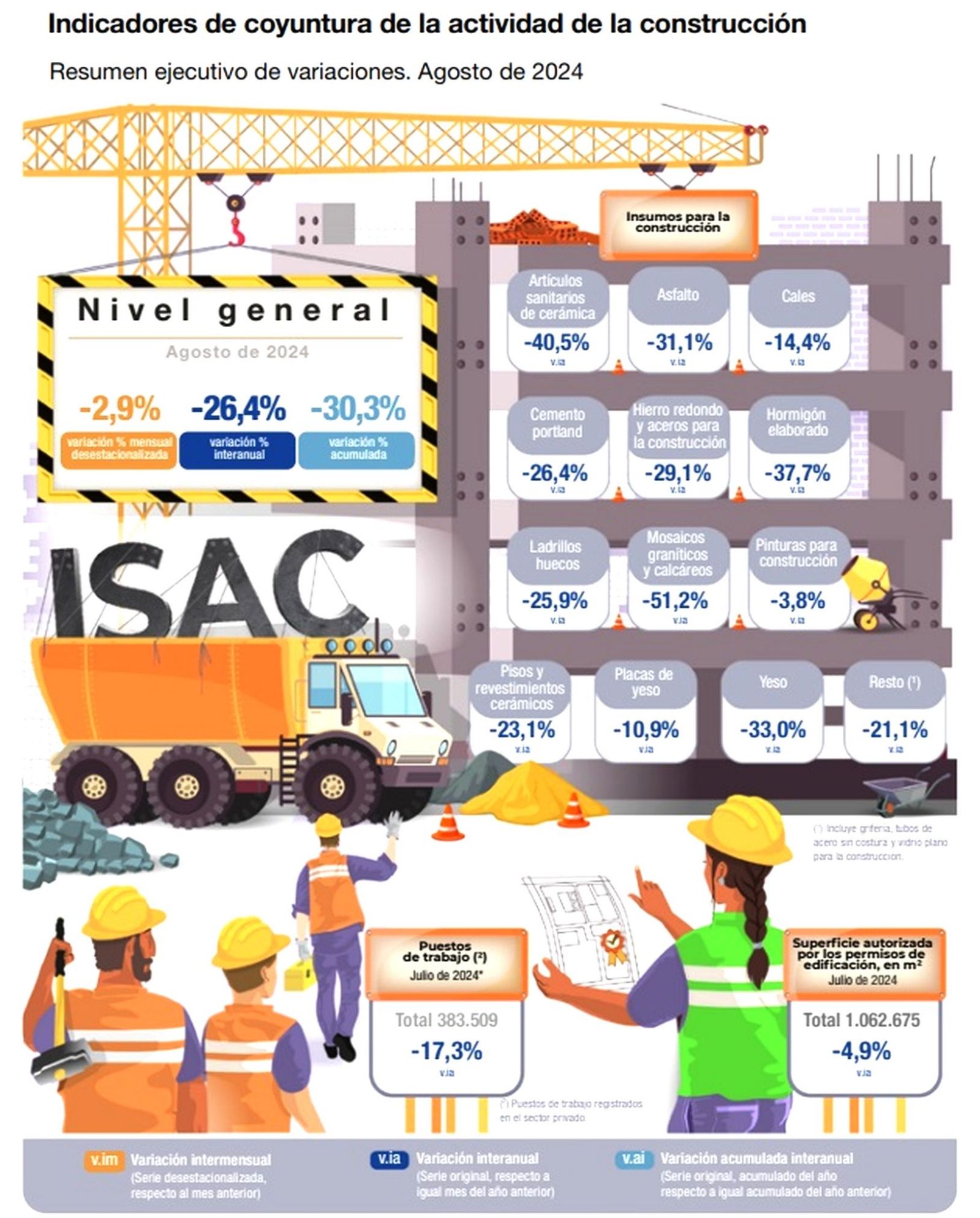 Según el último informe del Instituto Nacional de Estadísticas y Censos (Indec), el indicador de coyuntura de la actividad de la construcción (ISAC) del mes de agosto mostró una baja del 26,4% respecto a igual mes de 2023 y una caída intermensual del 2,9%. En el acumulado de los ocho meses medidos de 2024, la baja fue del 30,3% respecto a igual período de 2023.