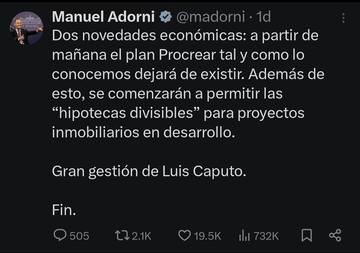 Como sucedió con otras decisiones del Gobierno de Javier Milei, el adelanto de la concreción de esta medida llegó ayer a través de la comunicación de Manuel Adorni. El vocero publicó en su cuenta de X la finalización del Plan Procrear “tal como se conocía” y celebró el trabajo de Luis Caputo.