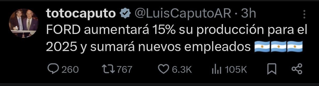 Luego del anuncio de Ford, el ministro de Economía, Luis Caputo, celebró la noticia en su cuenta de X. La decisión de la filial nacional de la compañía automotriz generará la incorporación de más de 160 colaboradores directos en la planta de Pacheco, donde se fabrica la Nueva Ranger.