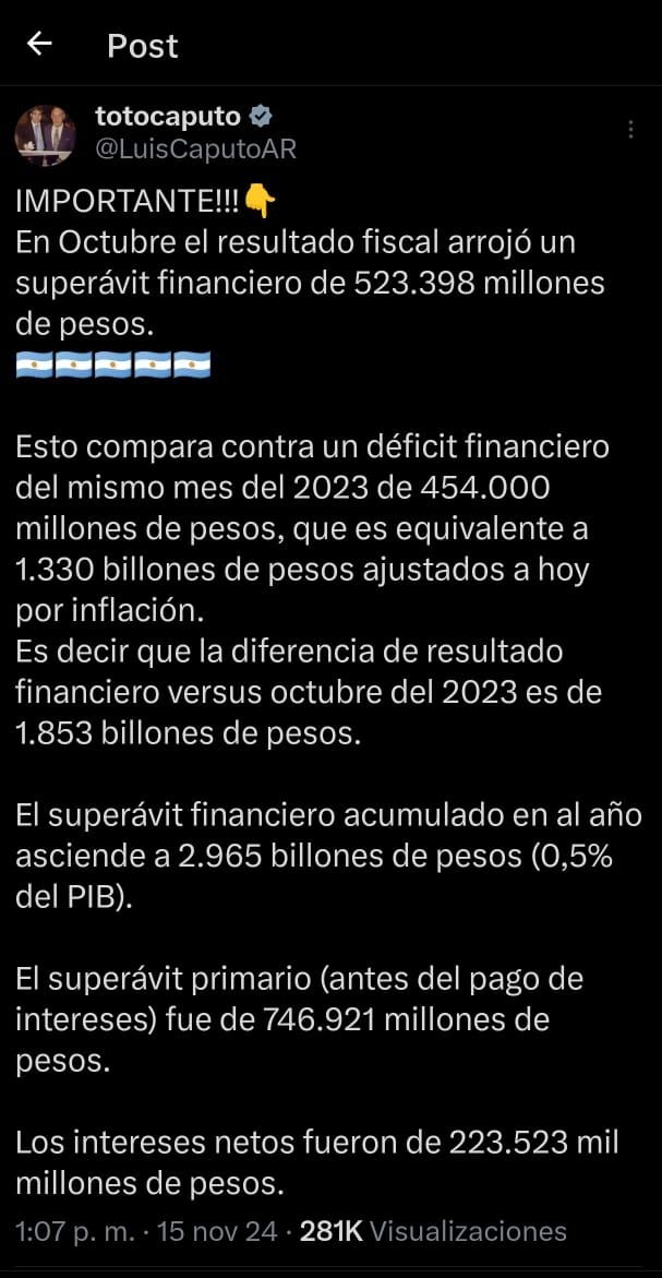 El ministro de Economía, Luis Caputo, publicó un mensaje en su cuenta de X (ex Twitter) celebrando el superávit financiero de $523.398 millones que se obtuvo en octubre. Comparó la cifra obtenida durante el mismo mes de 2023 que fue de $454.000 y señaló que la diferencia a favor representa $1.330 billones ajustados por la inflación.