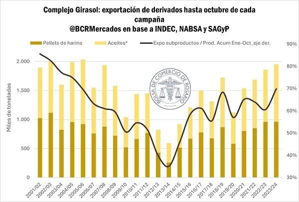 Según un análisis de la Bolsa de Comercio de Rosario, desde enero hasta octubre se vendieron al exterior volúmenes equivalentes al 70% de la producción industrial. De esta manera, se registró un crecimiento del 13% por encima del promedio habitual; el porcentaje más alto desde el mismo período de 2006.
