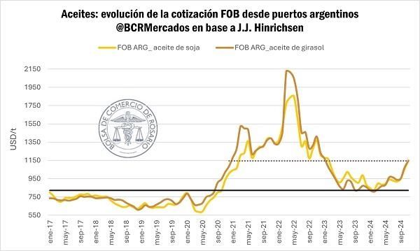 En este contexto, se estima que durante la campaña 2024/25 las exportaciones de aceites vegetales llegarían a un mínimo de tres años. En estas circunstancias el precio de estos productos se ve altamente afectado ya que cotizan muy por encima de los valores vigentes a principios de año.