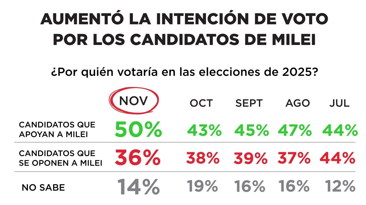 Los participantes de la encuesta también fueron consultados sobre la inclinación del voto para las próximas elecciones, que serán en 2025. El 50% de ellos respondieron que darían su apoyo a una lista oficialista. Este porcentaje representa un crecimiento si se lo comparación con el 43% que se pronunció sobre esa línea en octubre.